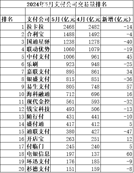 2024-08-08 第三方支付公司2024年6月份交易量排名出炉,总交易量