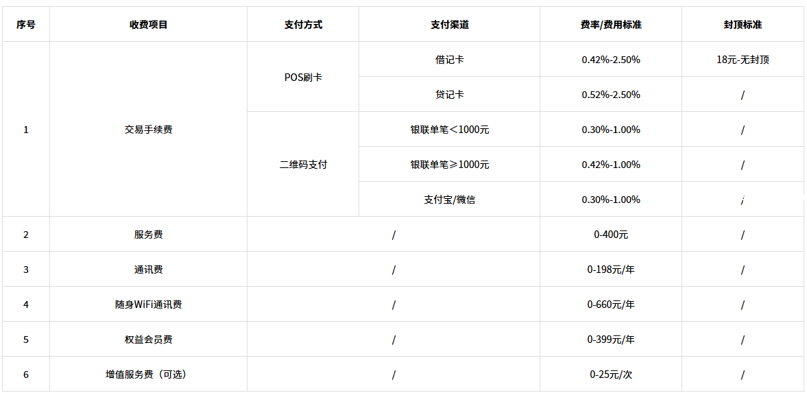 - 贷记卡交易:手续费区间为0.52%-2.5%,服务费0-400元;