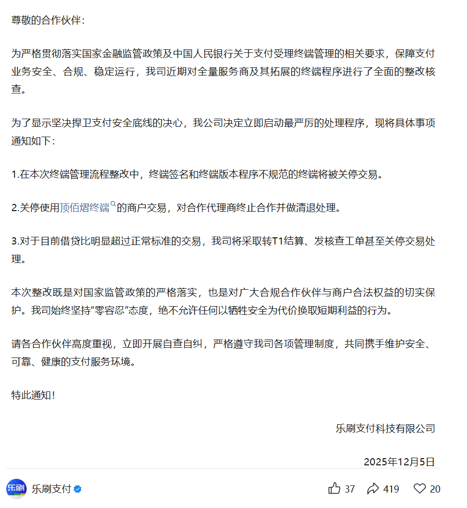核心提示:2025年12月5日,乐刷支付科技有限公司发布《关于严格执行终端程序整改核查及违规代理清退的通知》,在支付行业强监管背景下,针对终端程序合规性、违规代理及交易风险启动严厉整改,彰显其落实监管要求、捍卫支付安全的决心。