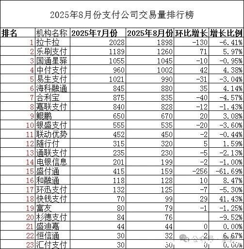 最近老有做支付的朋友问我,2025年8月份支付行业的交易量到底咋样了?这不,我刚扒到一份最新的排行榜,里面有23家支付公司的具体数据,今儿就跟大伙唠唠!说实话,这份榜单看下来,真的是有人欢喜有人愁,有的公司交易量噌噌涨,有的却直接跌麻了。