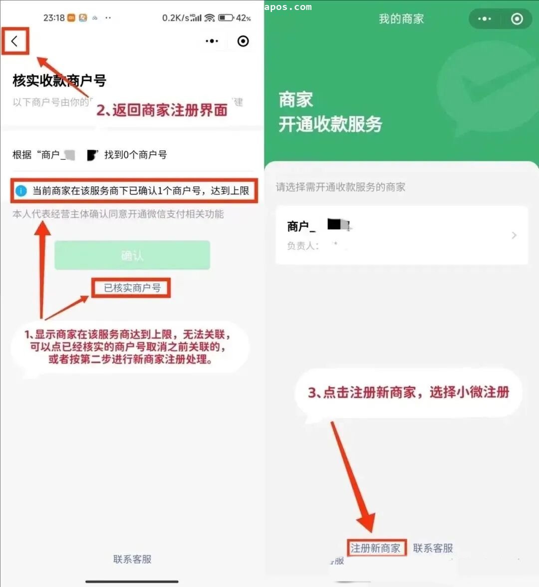 提示「服务商达到上限」:点击「已核实商户号」取消旧的子商户号关联,或返回选择「注册新商家」,轻松解决问题。