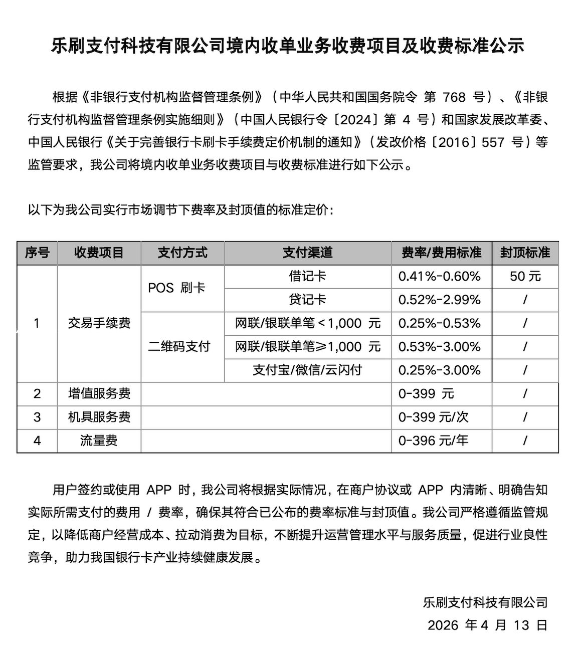 乐刷支付表示,会在商户协议与APP中明确展示实际收费标准,确保价格公开透明,符合监管公示要求。