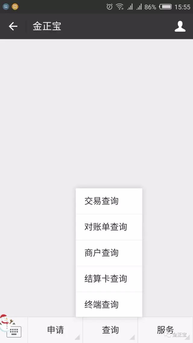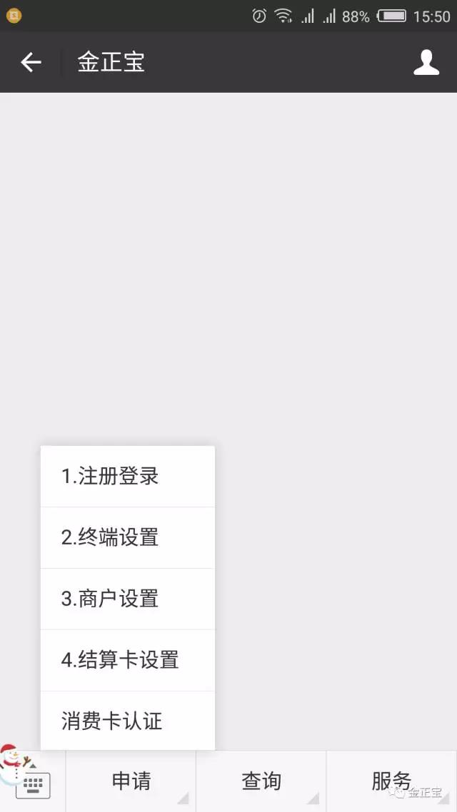 金正宝微信公众号功能包括申请、查询、服务三大菜单项,申请菜单中完成一系列终端使用前注册等设置操作,查询菜单是完成终端使用过程中各种交易、终端信息查询,服务菜单是常见问题解答和客服联系方式。