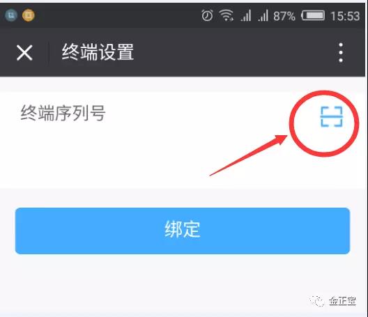 在公众号【申请】菜单中点击【2.终端设置】;点击右侧扫一扫的图标,扫描 MiniPos 机具设备开机后屏幕正面显示的二维码,点击绑定即可完成终端设置。