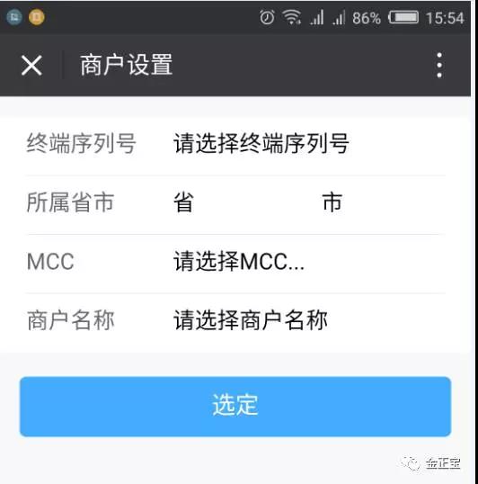 在公众号【申请】菜单中点击【3.商户设置】;选择要设置商户的终端序列号,选择省市、MCC、选择可用的商户名称,点击选定。可以为每个已绑定终端设置一个商户,后续更换商户也在此处操作。