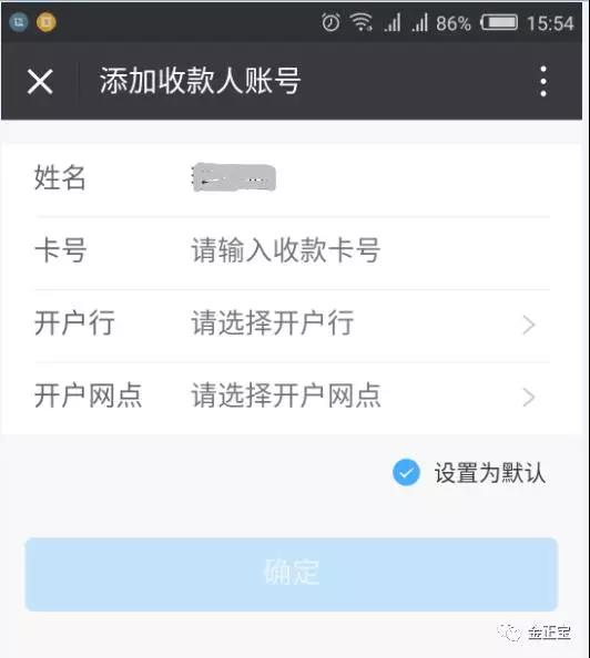 在公众号【申请】菜单中点击【4.结算卡设置】;按提示添加收款人账号信息,点击确定。注:不绑定结算卡,无法做交易。
