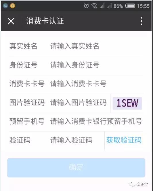 在公众号【申请】菜单中点击【消费卡认证】;填写磁条卡持卡人的信息和验证码,点击确定。