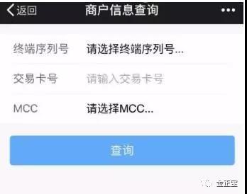 在公众号【查询】菜单中点击【商户查询】,选择序列号、交易卡号、MCC 等条件,点击查询。可按照终端、交易卡号、MCC 的条件,查看商户历史的交易汇总信息。