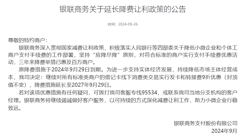 银联商务在9月26日公布了一则公告,明确表示将原本计划于2024年9月29日结束的降费措施延长至2027年同一日期。该举措旨在进一步支持实体经济的发展,并持续降低市场主体的经营成本。具体而言,银联商务将继续对所有标准类商户的借记卡线下消费类交易实施发卡和转接费的9折优惠(封顶值保持不变)。
