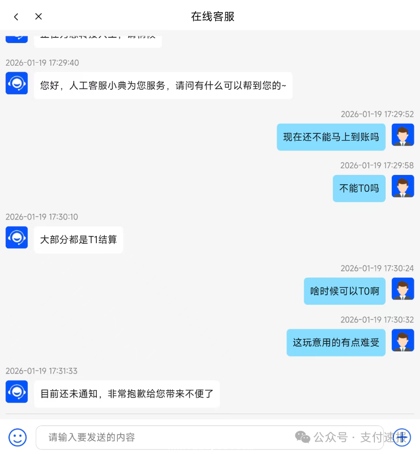 然而,不少商户满怀期待地咨询乐刷官方客服,询问D0秒到具体恢复时间时,得到的答复却截然相反。客服明确表示,目前乐刷大部分交易仍执行T1结算,关于D0快速到账的恢复时间,暂时没有收到任何官方通知,让商户以实际到账规则为准。