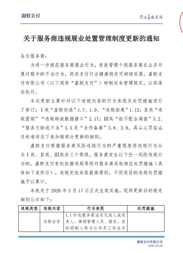3月18日,嘉联支付发布《关于服务商违规展业处置管理制度更新的通知》,这份新规在原有基础上修订了多项违规细则,明确将违规行为分3类,最高扣罚10万元,还明确了生效时间和处罚执行标准!今年已有2家头部支付公司跟进出台类似规范,支付服务商合规展业刻不容缓,别踩红线亏大钱!