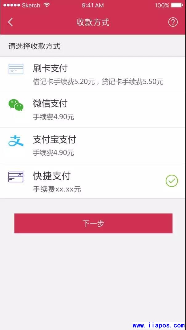 输入消费金额,选择“业务类别”:小微商户收款、上门收款(快递\送餐\房租等)、生活缴费(物业费\水电煤\停车费等)之后,点击“下一步”,选择“收款方式”。